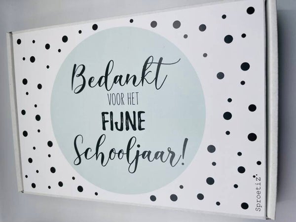 Tof pakketje als bedankje voor de meester, met een pen, potlood, bedankkaartje en notitieboekje. Verpakt in een mooi cadeaudoosje.
