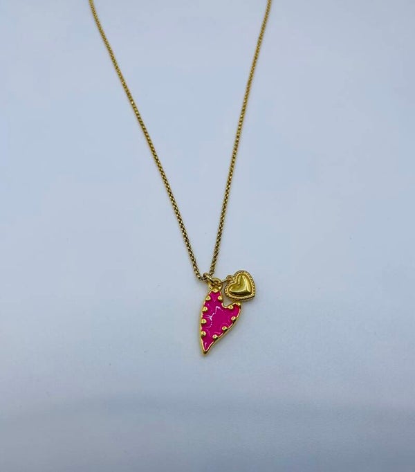 Deze vrolijke zomerse ketting maakt jouw outfit compleet. De hanger is een combinatie van een goudkleurig- en roze hartje. De ketting is 47cm lang en voorzien van een verlengketting van 6cm.