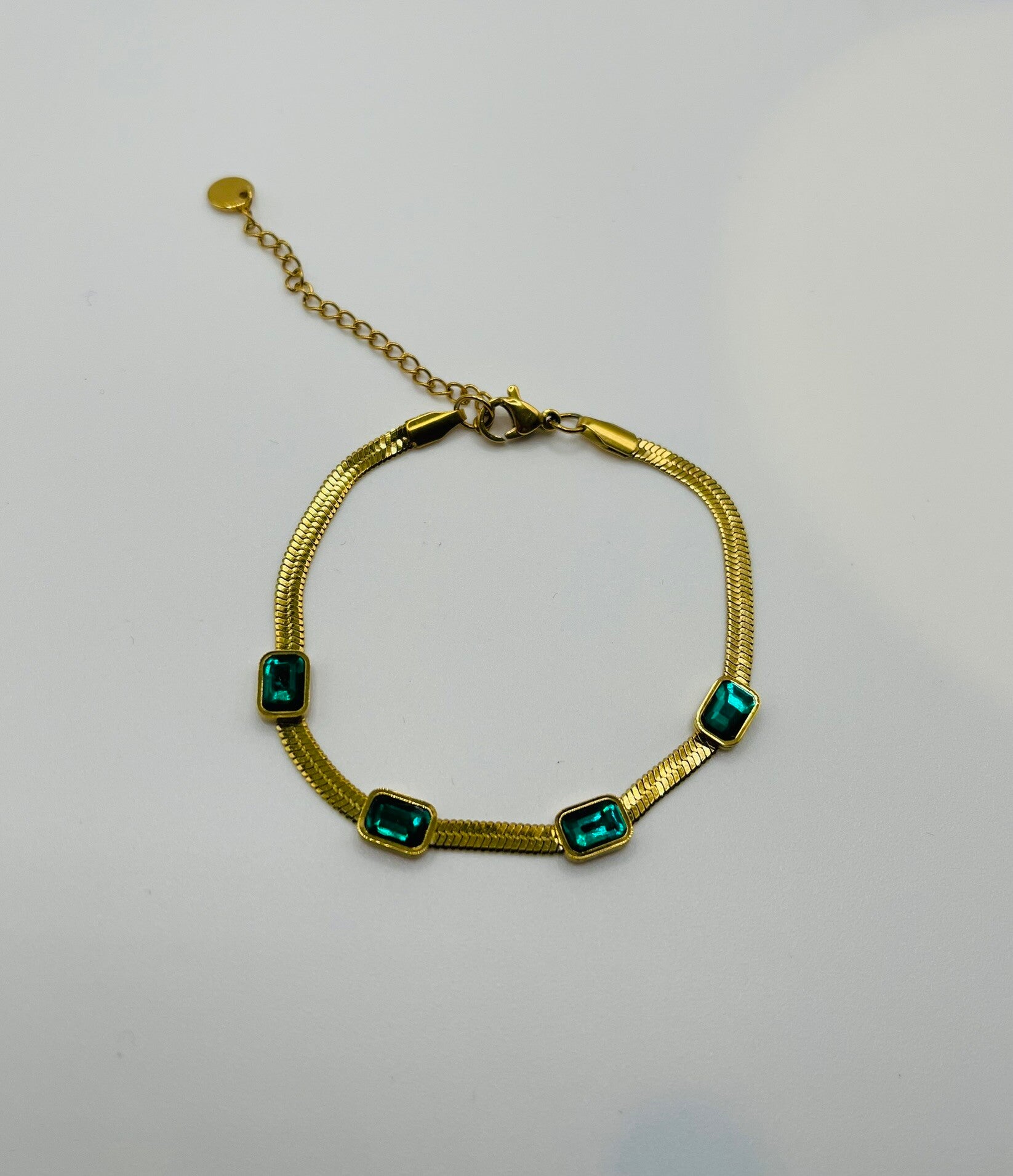 Deze trendy armband is gemaakt van stainless steel. Dit verkleurt niet, vlekt niet en zorgt zelden voor irritatie. De armband is voorzien van fraai steentje van crystal glas in de kleur groen en heeft een lengte van 22cm inclusief een verlengketting van 5cm