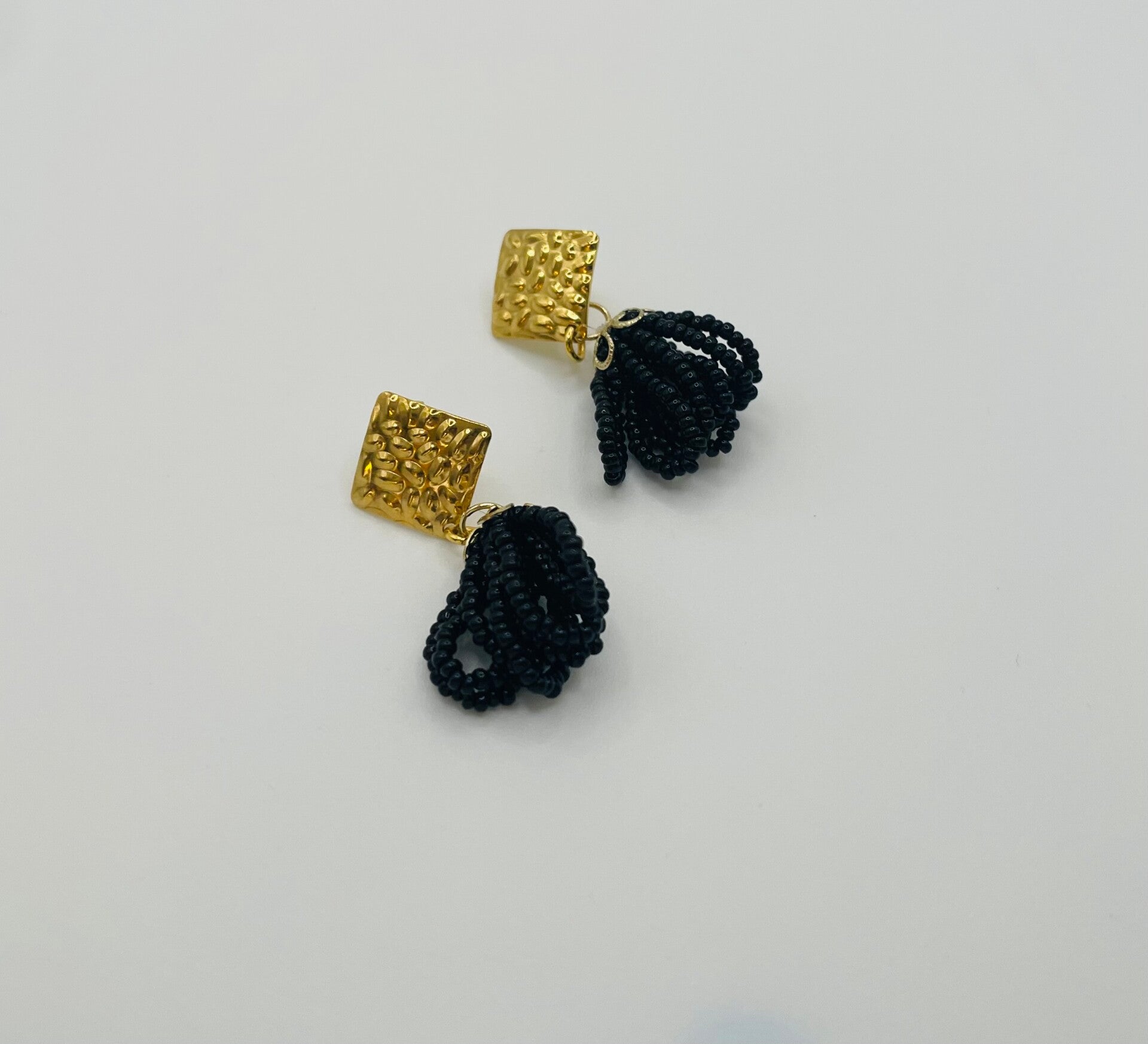 Deze oorbellen zijn voorzien van stekertjes van stainless steel en een hangertje gemaakt van kleine zwarte kraaltjes.