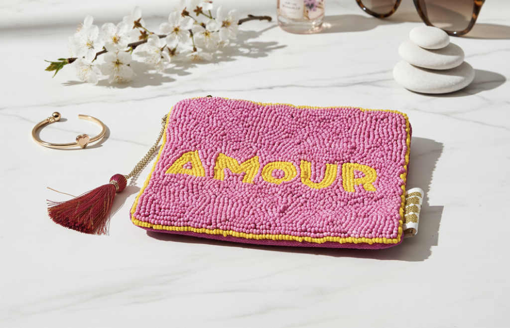 Deze prachtige etui met de tekst 'amour' is met zorg en aandacht met de hand gemaakt in India, van onder meer viscose en glas. De etui is super handig om jouw handtas netjes te houden. Gebruik hem bijvoorbeeld om je lipstick, kauwgom of andere kleine spulletjes in op te bergen. Deze etui is ongeveer 14x12,5 cm groot.