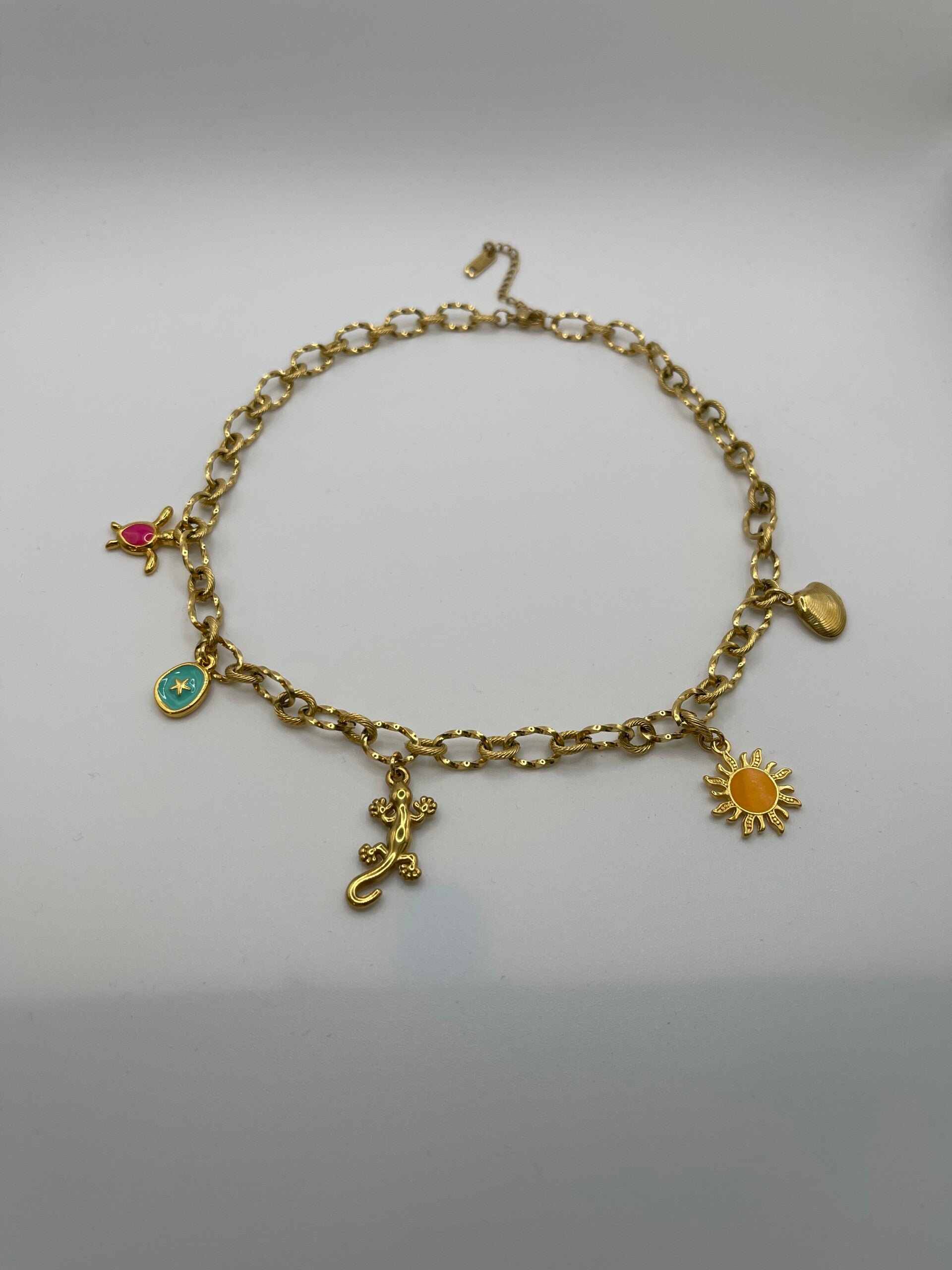Deze chunky vrolijke ketting is een echte eyecatcher en heeft een lekker zomerse uitstraling. De ketting zelf is gemaakt van stainless steel. De gekkobedel en schelp zijn eveneens gemaakt van stainless steel. De bedel met zon, schildpad en ster zijn gemaakt van metaal en gecoat met 24k goud en voorzien van een mix van epoxy en kunsthars.