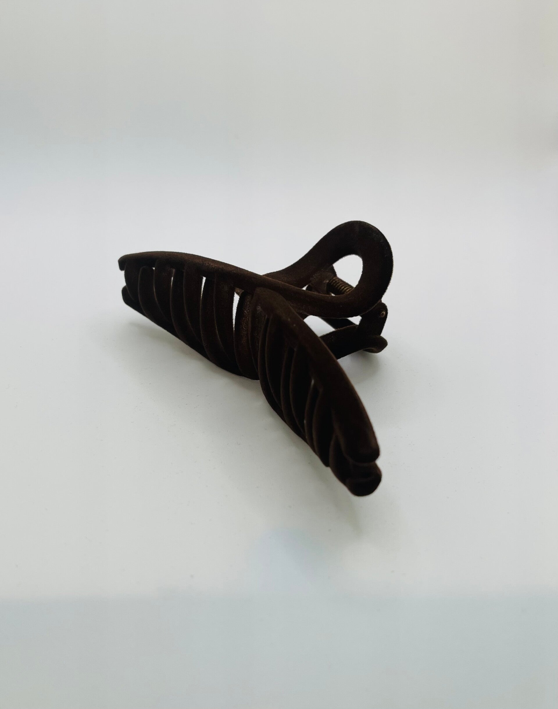 Deze trendy haarklem in de kleur donkerbruin heeft een velours uitstraling en is ongeveer 11 x 5 cm.